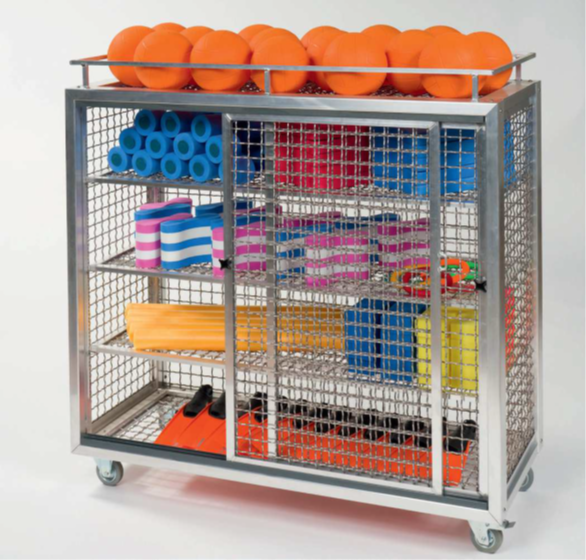 Äußerst stabile und formschöne Ausführung durch System-Profile. Überall wo Kleingeräte oft transportiert werden müssen, ist dieser Gerätewagen unentbehrlich und hat sich bereits vielfach im Einsatz von Bädern, Schulen, Vereinen und auch in Sporthallen bestens bewährt. Alle Geräte sind sofort und übersichtlich sortiert. Platzsparende Unterbringung aller Geräte. Der Wagen kann miteinem Bügelschloss, welches im Lieferumfang nicht enthalten ist, abgeschlossen werden.