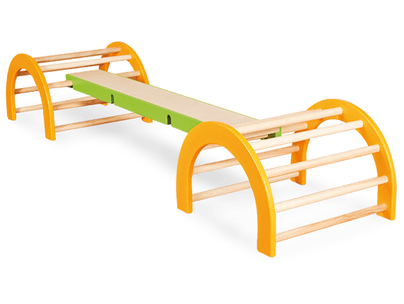 das Balancier-/Wippbrett ist 150 cm lang, 20 cm breit und mit 2 Sitzen versehen.