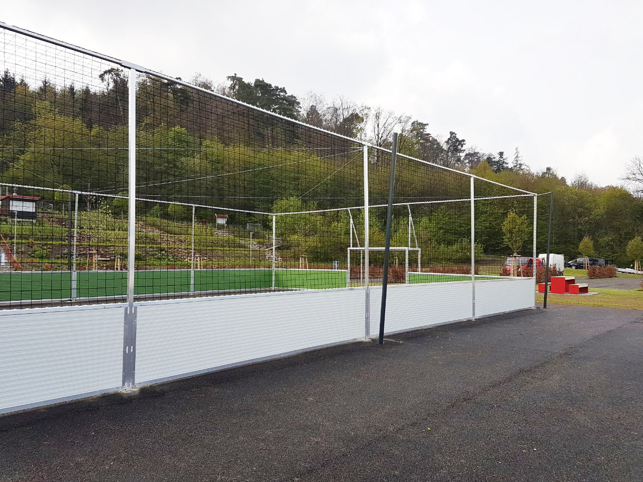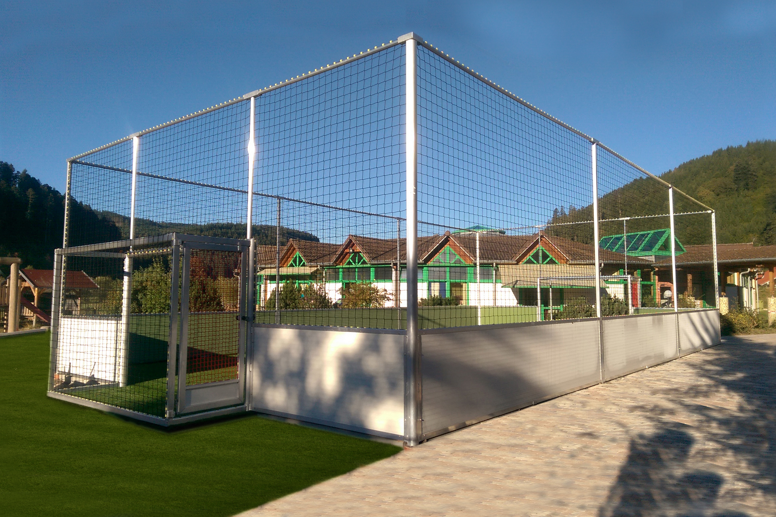 (Das Foto zeigt ein umlaufendes Schutznetz, dass gegen Aufpreis in MW100 mm oder MW45 mm geliefert werden kann. Höhe 3,0 m oder alternativ 4,0 m)