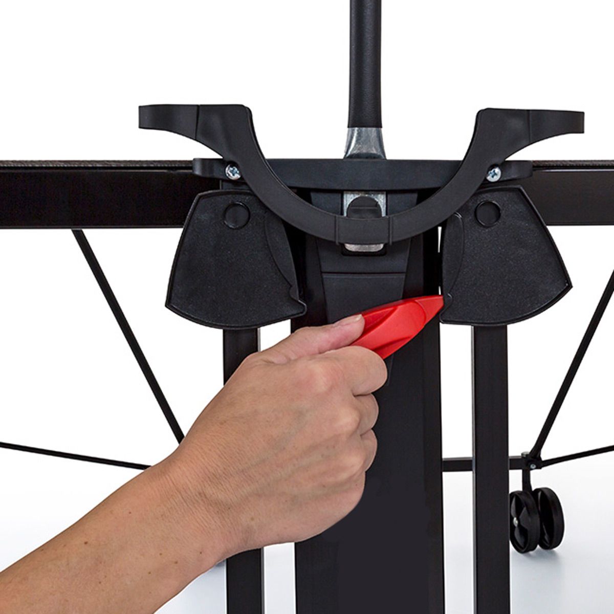 - Drehgriff-System mit Einrastmechanismus beim Zusammenklappen des Tisches in Abstellposition